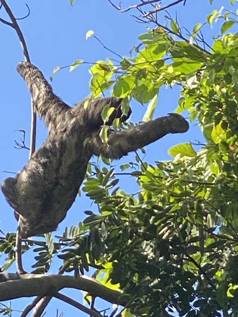 Just as we’re leaving the park and about to give up, we spot something high up in a tree. He’s a bit shy at first but then a long arm reaches out to grab a nearby branch with its long claws, then we see the classic sloth upside down pose. Finally he shows his face much to the glee of the small crowd that’s gathered, including our friends the Avocadoes who happen to be sloth seeking as well.