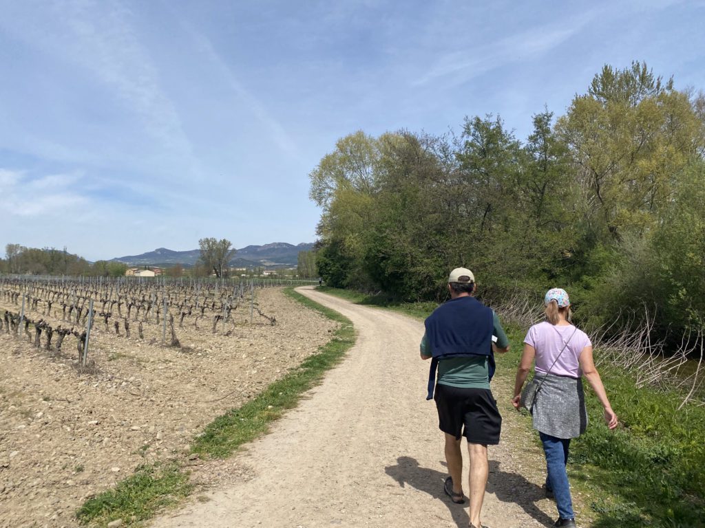 A quick stop to introduce Dene and Kerry to the wonders of Decathalon and on to La Rioja (Ree-oh-ha). We didn’t have grand plans for our visit to this part of the country. We figured some family time playing golf and tennis, lounging around in the backyard, board games at night, maybe a bit of wine tasting if it worked out. Wow, did we under-estimate this region. We could have stayed for a lot longer than the few days we had. It helped that the warm weather arrived and we were basking in sunshine. The region of La Rioja is simply stunning, with the Ebro River winding its way along the wide valley between two mountain ranges. Picturesque villages, rolling fields and vineyards as far as the eye can see. Yep, we’re in Mediterranean Europe. One of the boxes on Michelle’s list for the Spain trip was some walking / hiking in the countryside and mountains. With the Spanish love of walking and hiking there were countless choices from a Via Verde (old railway routes) through the fields of the valley, to taking part of a pilgrims’ way (the Camino Frances comes from France and through the La Rioja region), walking town to town or venturing up into the mountains. We managed to do a bit of it all but only just scratched the surface.